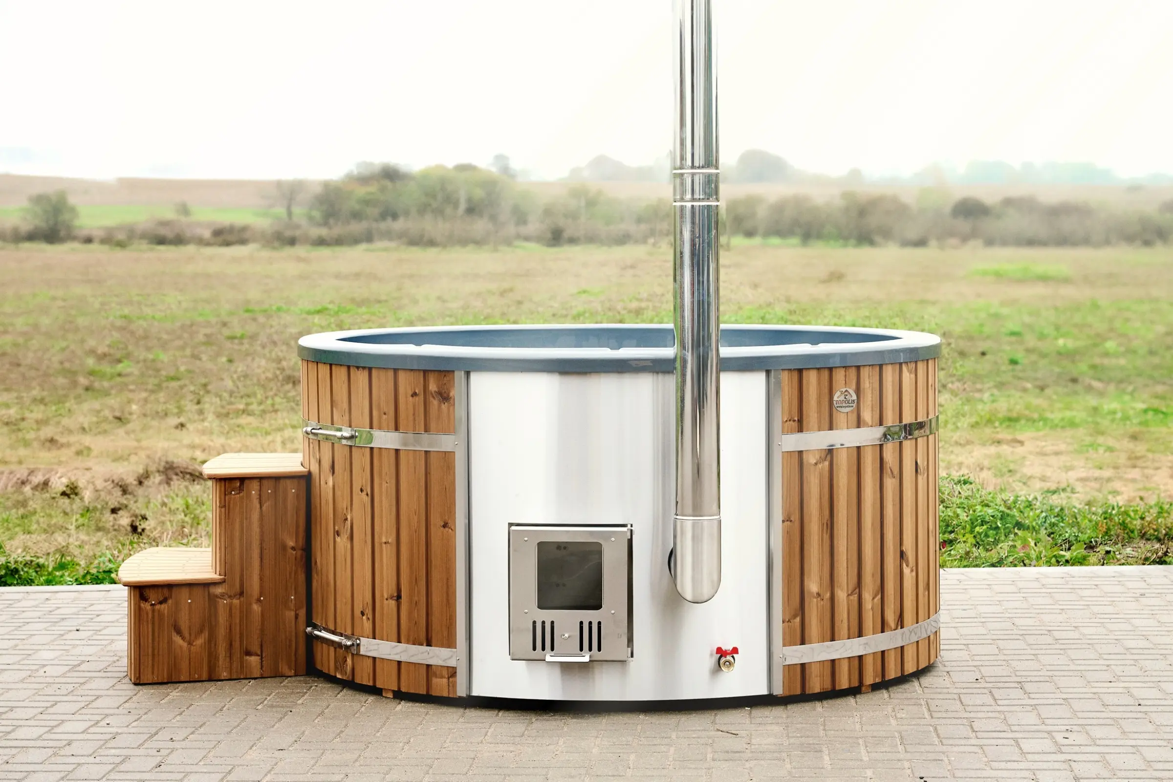 Modern badtunna med integrerad kamin och extra snabb uppvärmning